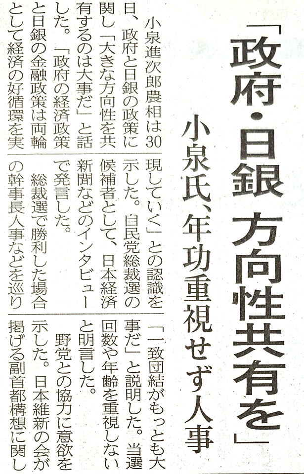 今朝の日経4面に、小泉進次郎氏が「政府・日銀 方向性共有を」と発言したとある。
