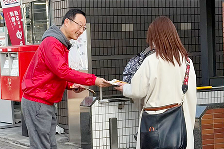 知名度ゼロからの闘い。 今朝は京王堀之内駅で立ちました。