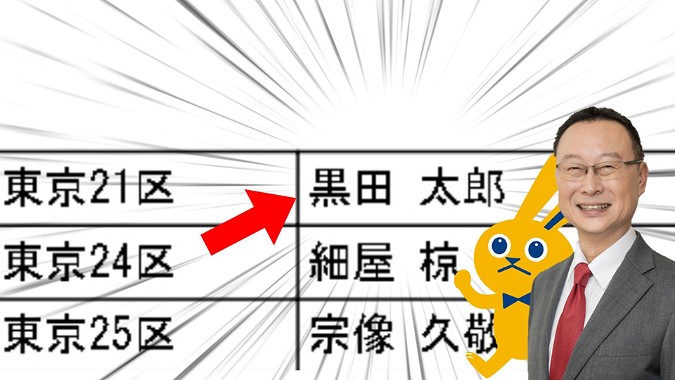 東京21区に黒田太郎と名前があり、「え?同姓同名?」といった反応もあるようですが、これは現在愛知県議会議員の黒田太郎です。